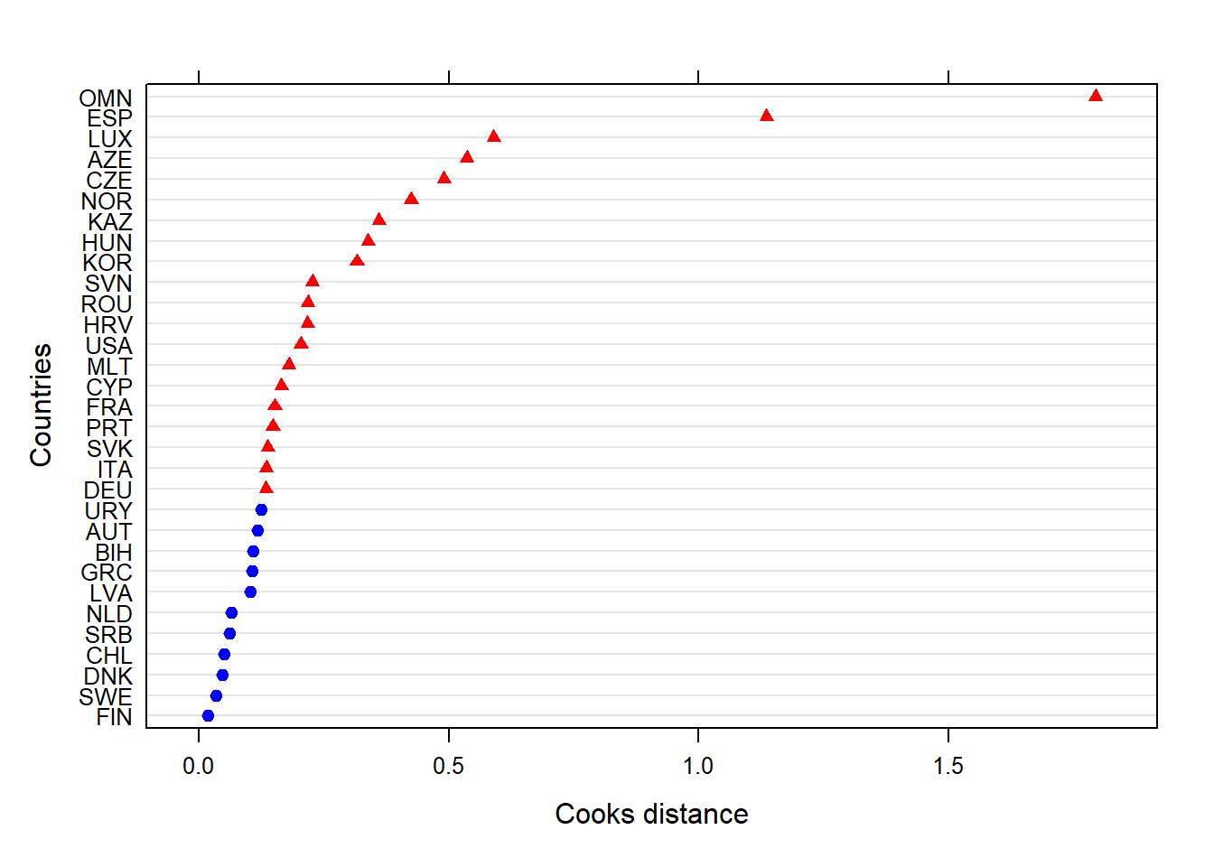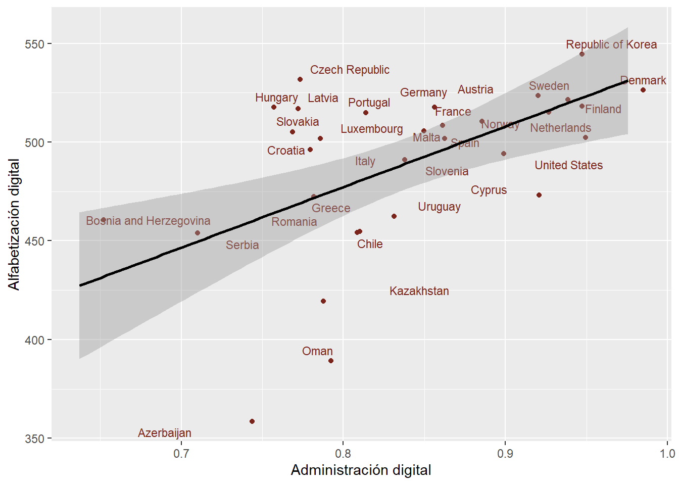 Figura 2 Representa la correlación entre alfabetización digital y administración digital, la cual tiene un efecto positivo y moderado. Se puede apreciar que la mayoría de los países se concentran entre el 0.8 y 0.9, lo cual es bastante alto tomando en cuenta que el índice va desde 0 a 1. Llama la atención Dinamarca que, si bien su puntaje de administración digital es 0.98, siendo el país que puntúa más alto, en el gráfico se muestra sobrepasando el valor 1. En segundo lugar está Korea, lo cual es consistente con el resultado de la correlación.