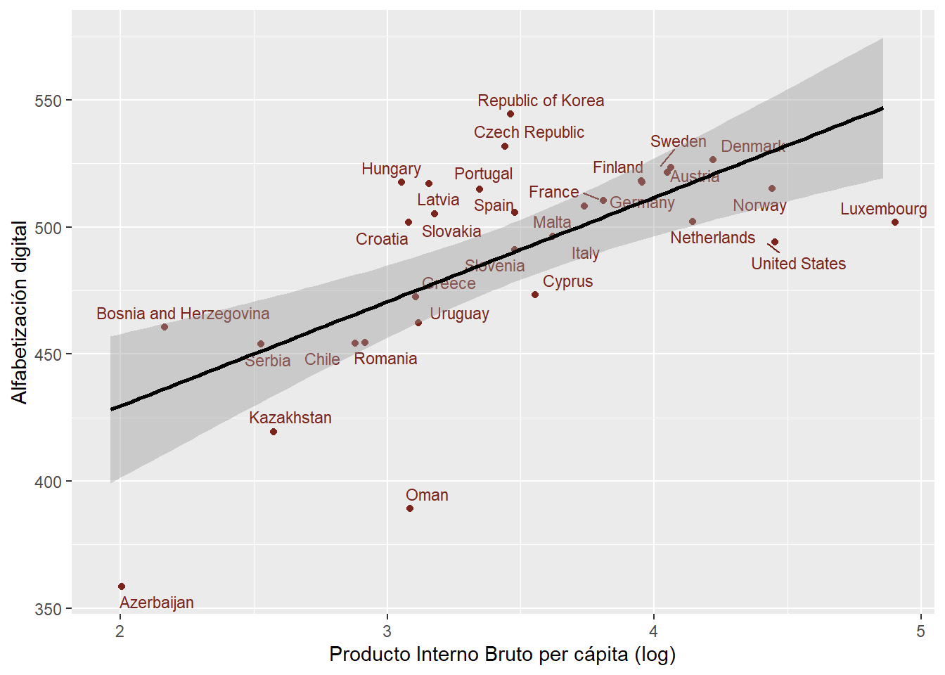 En Figura 1 se observa la correlación entre alfabetización digital y el logaritmo de PIB per cápita. La correlación entre ambas variables es positiva y con un efecto fuerte. En general, los países se ven dipersos conforme a la recta, lo que significa que a mayor PIB per cápita, mayor alfabetización digital. Aun así, es interesante observar casos como los de Korea y República Checa, que son los dos países que tienen el promedio de alfabetización digital más alto pero no son aquellos con el mayor PIB per cápita.