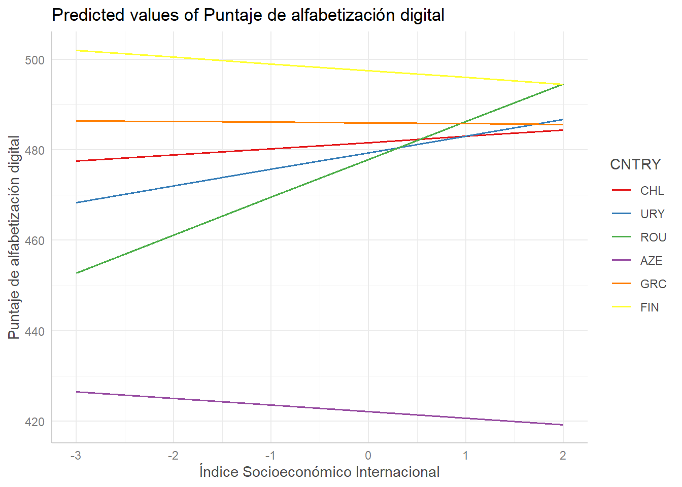 Las condiciones socioeconómicas de un país pueden moderar la relación entre el puntaje de alfabetización digital y el nivel socioeconómico de los estudiantes. Los países más ricos, sobre todo en Europa, suelen ser también más igualitarios en términos económicos y, al mismo tiempo, tener puntajes de alfabetización digital sobre el promedio (Fraillon 2024). En esta lógica, se esperaría que en los países económicamente desventajados, las disparidades en el puntaje de alfabetización digital sean exacerbadas por el nivel socioeconómico de los estudiantes.